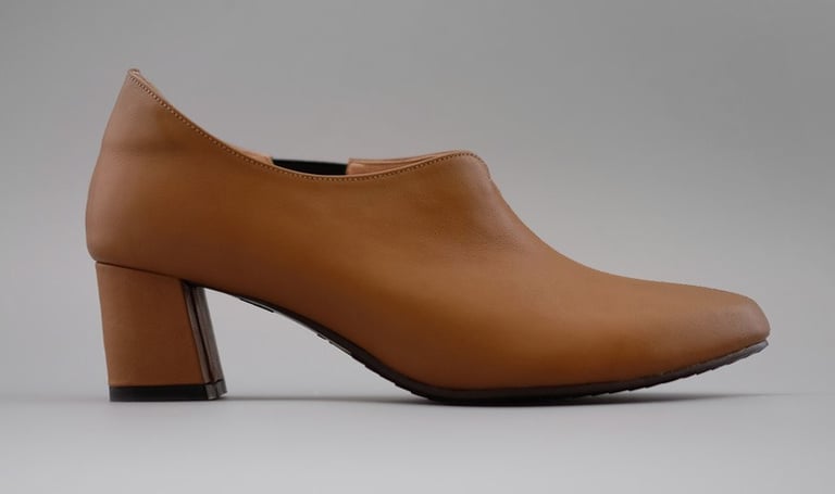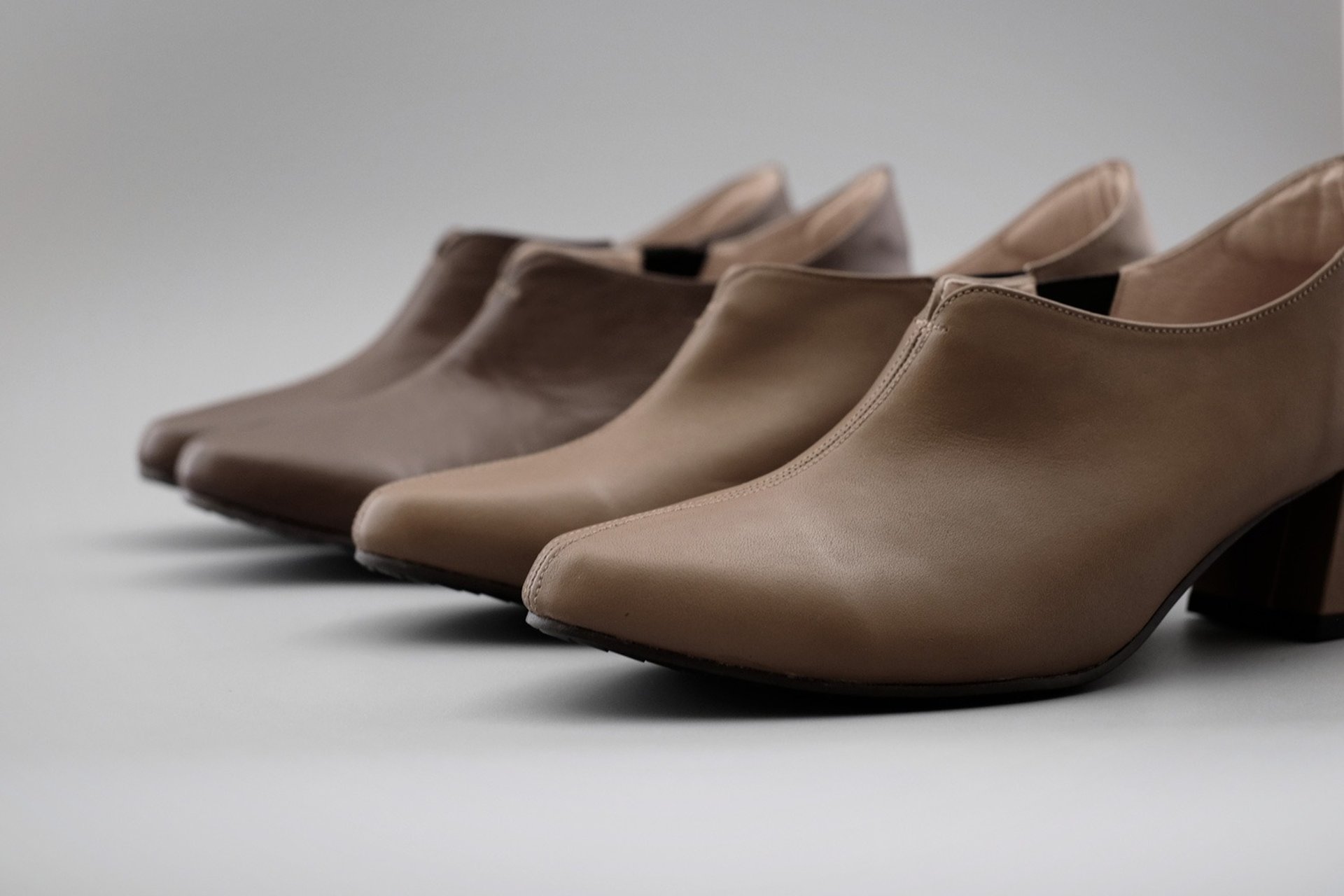 用雙手並使用皮革材料來包覆鞋跟,是精品呈現的工序,是與快速、量產、規格化產品有差異。鞋楦與鞋跟的設定,更是攸關穩定度的關鍵。考量到生活中穿脫之間的情境外,靴口的收放細節,4.5公分的高度是身形延伸的完美比例。