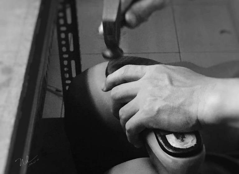 手中的槌子,有節奏地敲打,是完成一雙鞋的標準過程,美妙的節奏是肌肉記憶所連結的二連音。幾年前,時常看到標榜手工鞋來販售產品、為誰代工、支持台灣製造,這應該是無法自我認同和情感索取過程。
